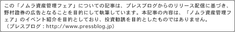 今日は「ノムラ資産管理フェア」をご紹介。 野村證券はここ何年か東京、大阪、名古屋で個人投資家の為のマネーイベント、その名も『ノムラ資産管理フェア』を開催している。 今年開催される「第9回ノムラ資産管理フェア」は12月1日(金)・2日(土)の2日間の10:30~18:30の間で有楽町の東京国際フォーラムで開催される。 具体的な内容は講演会や上場企業による情報コーナー、資産管理セミナーなどの役立つ情報が取り揃えられているので興味がある人は足を運んでみてはいかがだろうか? 入場料は無料だしね。 PR