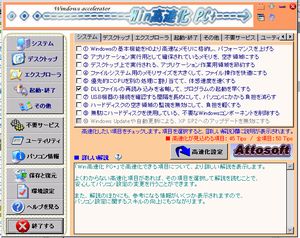 このソフトを使って高速化しちゃいましょう。 その名も「Win高速化PC+」 ダウンロードはこちらより。 作者様のサイトが消えてしまっているので使い方などは自力で(゚∀゚)アヒャヒャヒャ まぁ簡単なんで初心者でもわかると思います。 不明な点はご連絡を。 PR